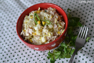 2. Wędlinę pokroić w kosteczkę, dorzucić do jajek. Por przekroić na pół, pokroić w półplasterki, włożyć na sitko i przelać wrzątkiem, odsączyć i przełożyć do miski. Kukurydzę, selera i ananasa odsączyć z zalewy.